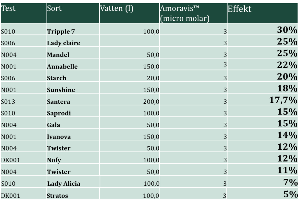 Odlare beskriver odlingsförhållanden 2025 som blandade: kraftiga regn skapade utmaningar i norra Sverige medan södra Sverige uppnådde rekordskördar. Trots detta rapporterade odlare över hela landet positiva resultat med Amoravis™ – både under stressade förhållanden och i områden som redan hade rekordhöga skördenivåer. Detta visar att behandling av sättpotatis med Amoravis™ kan leda till högre avkastning oberoende av olika vädermönster och odlingsförhållanden.